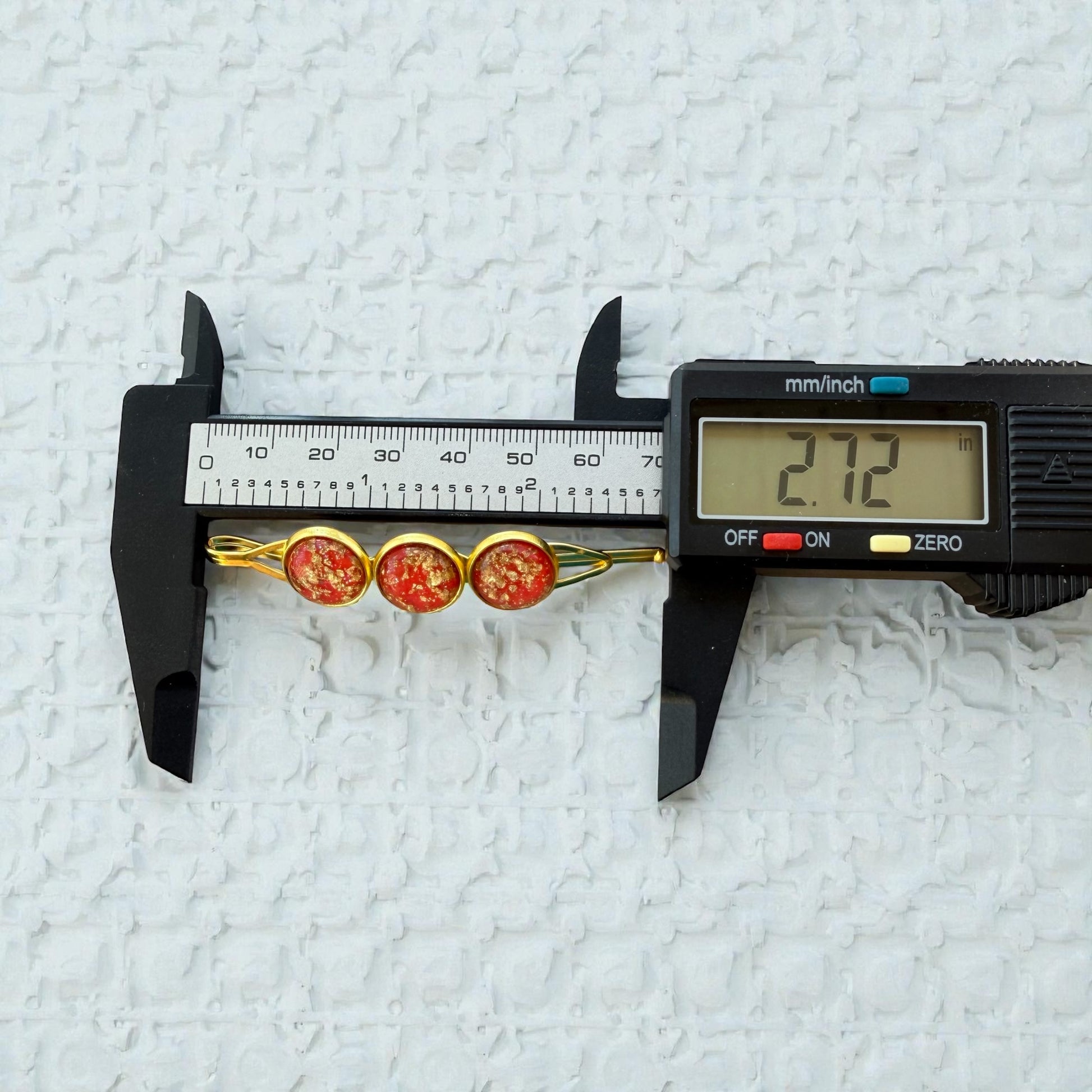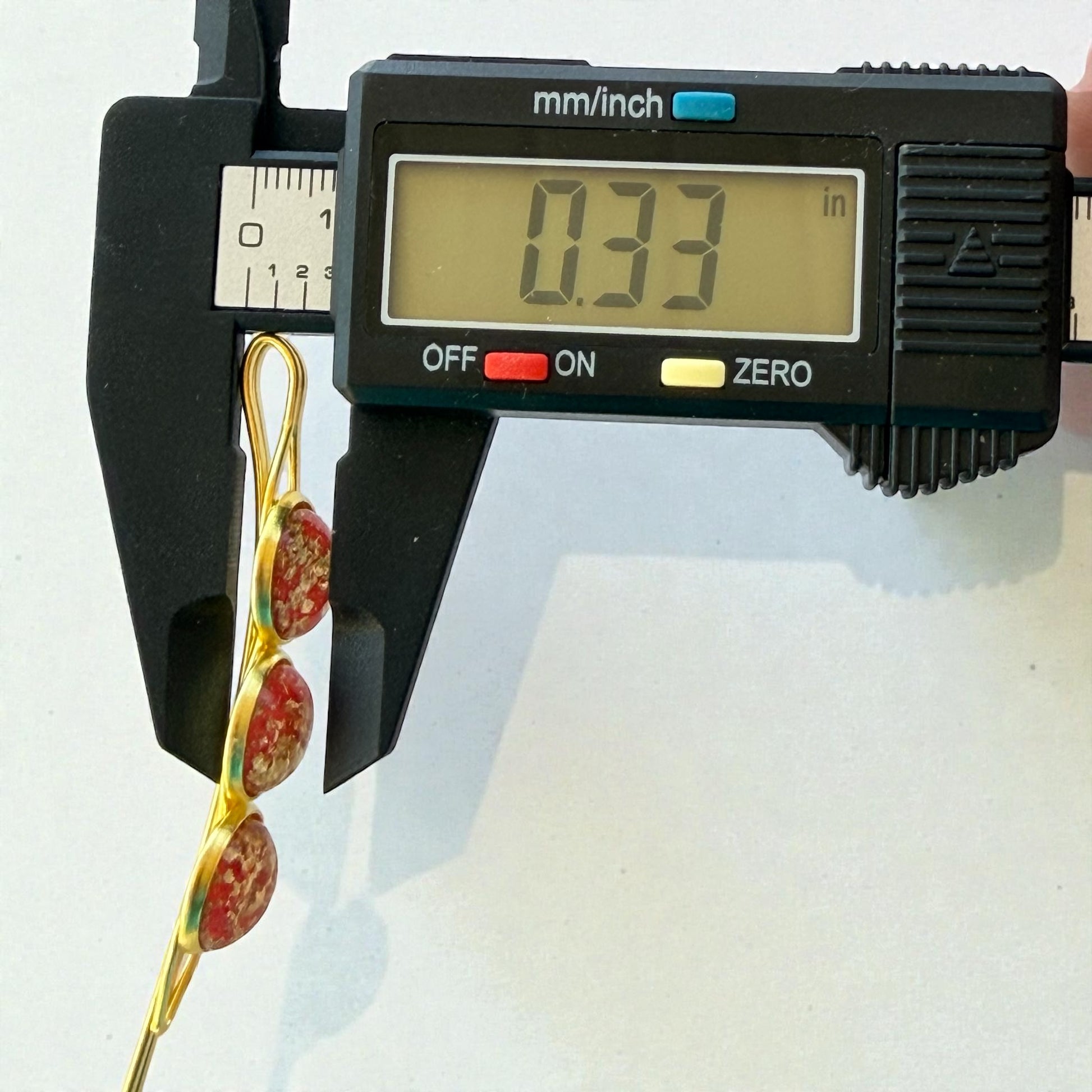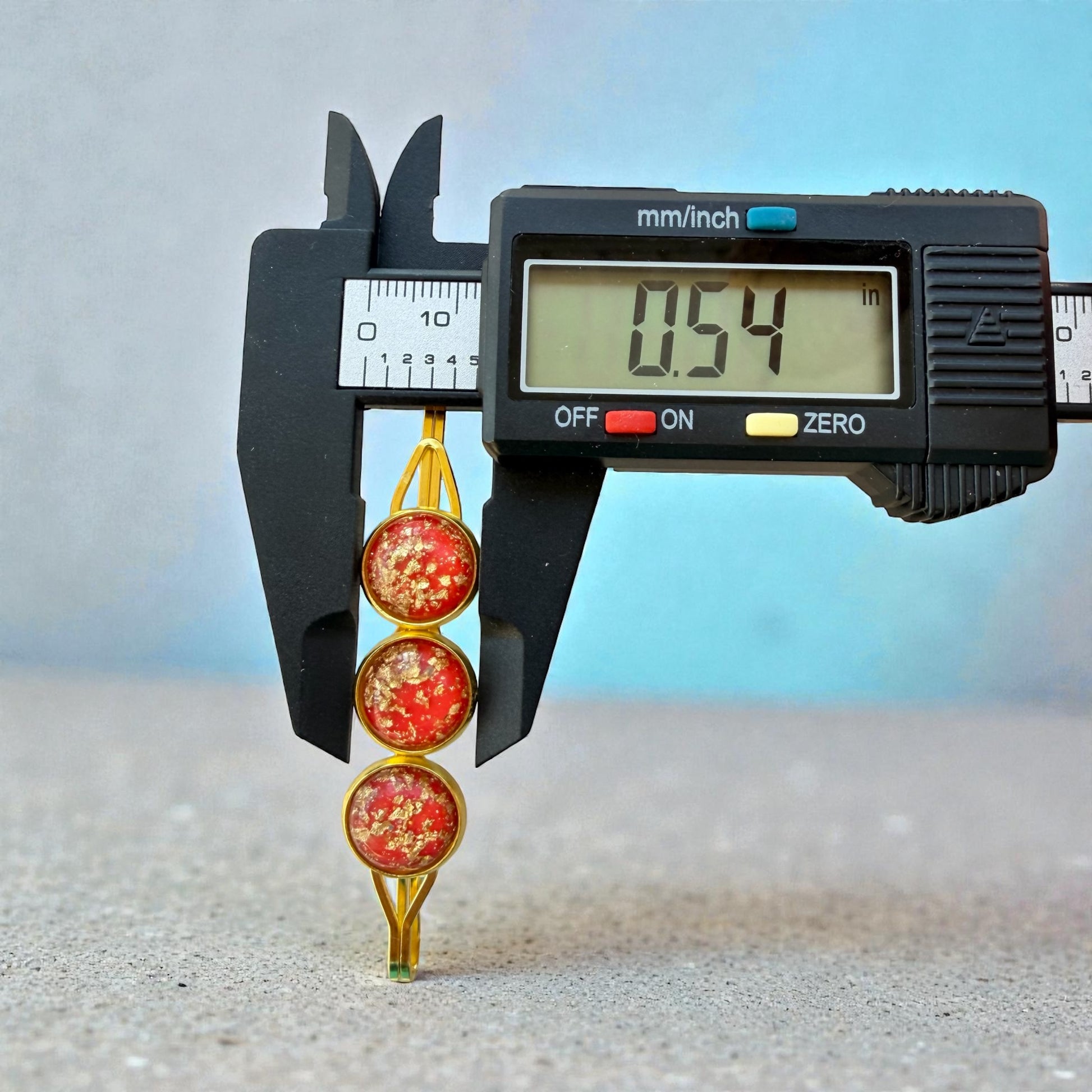 - Finish: Glossy red resin with gold foil flakes in gold-tone settings