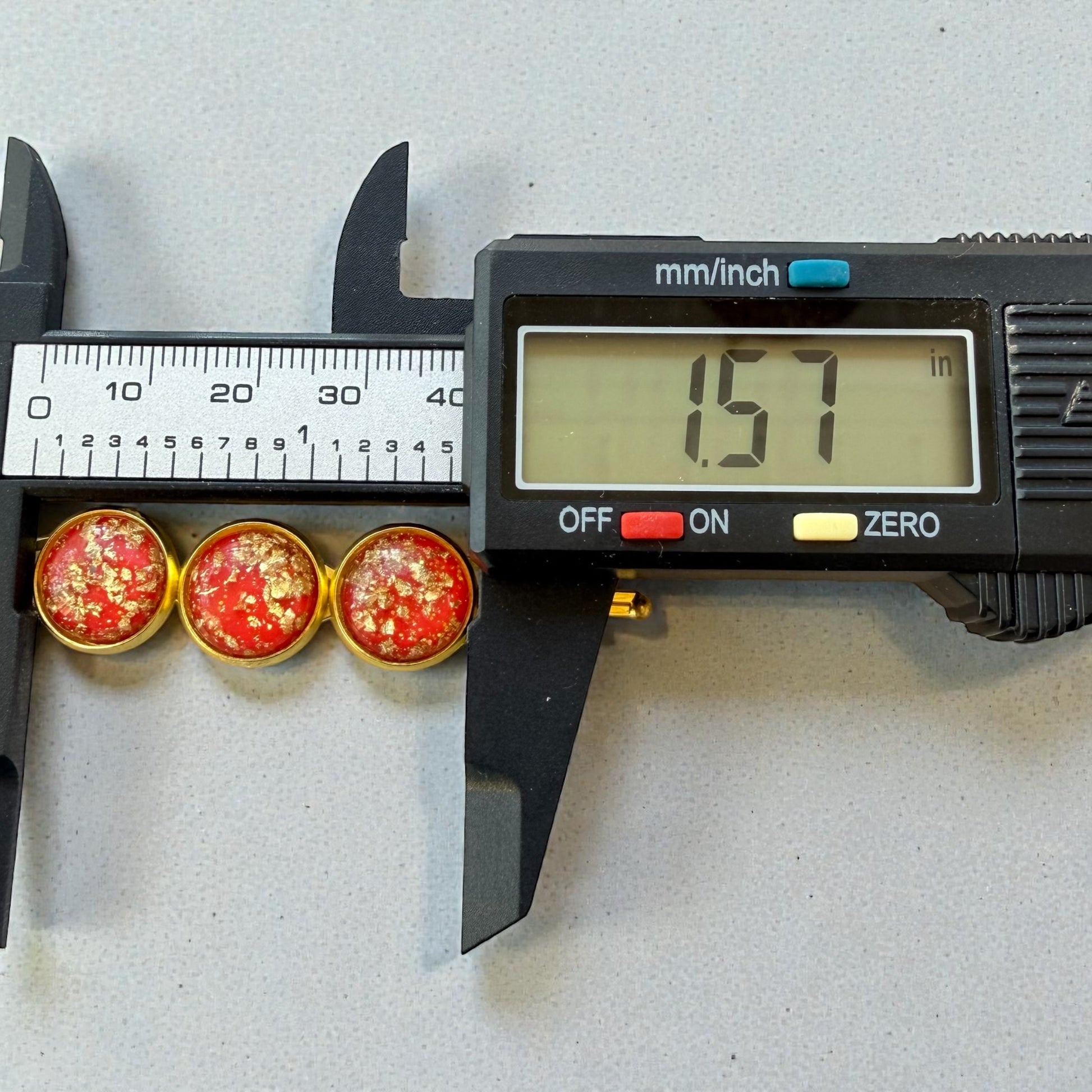- Vibrant red resin domes with gold foil glitter for eye-catching sparkle