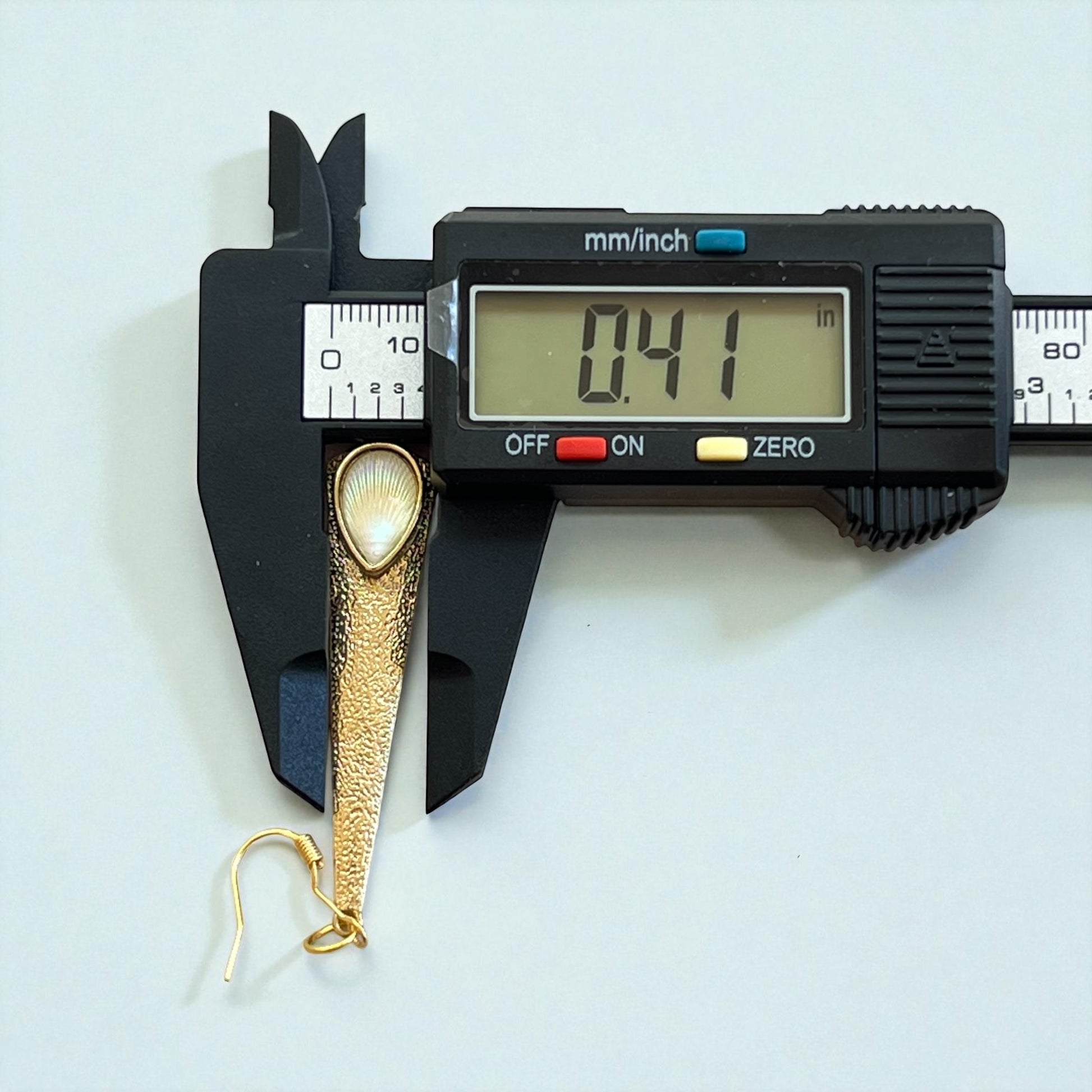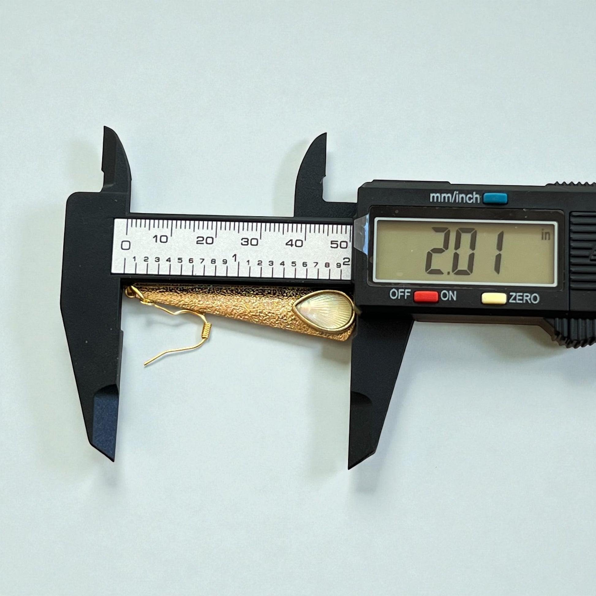 Sleek, golden, and glow-kissed—these long tapered dangle earrings feature a richly textured gold drop set with an iridescent, shell-style teardrop cabochon. They catch the light beautifully for a refined boho-glam look that works from everyday to dressy nights out.