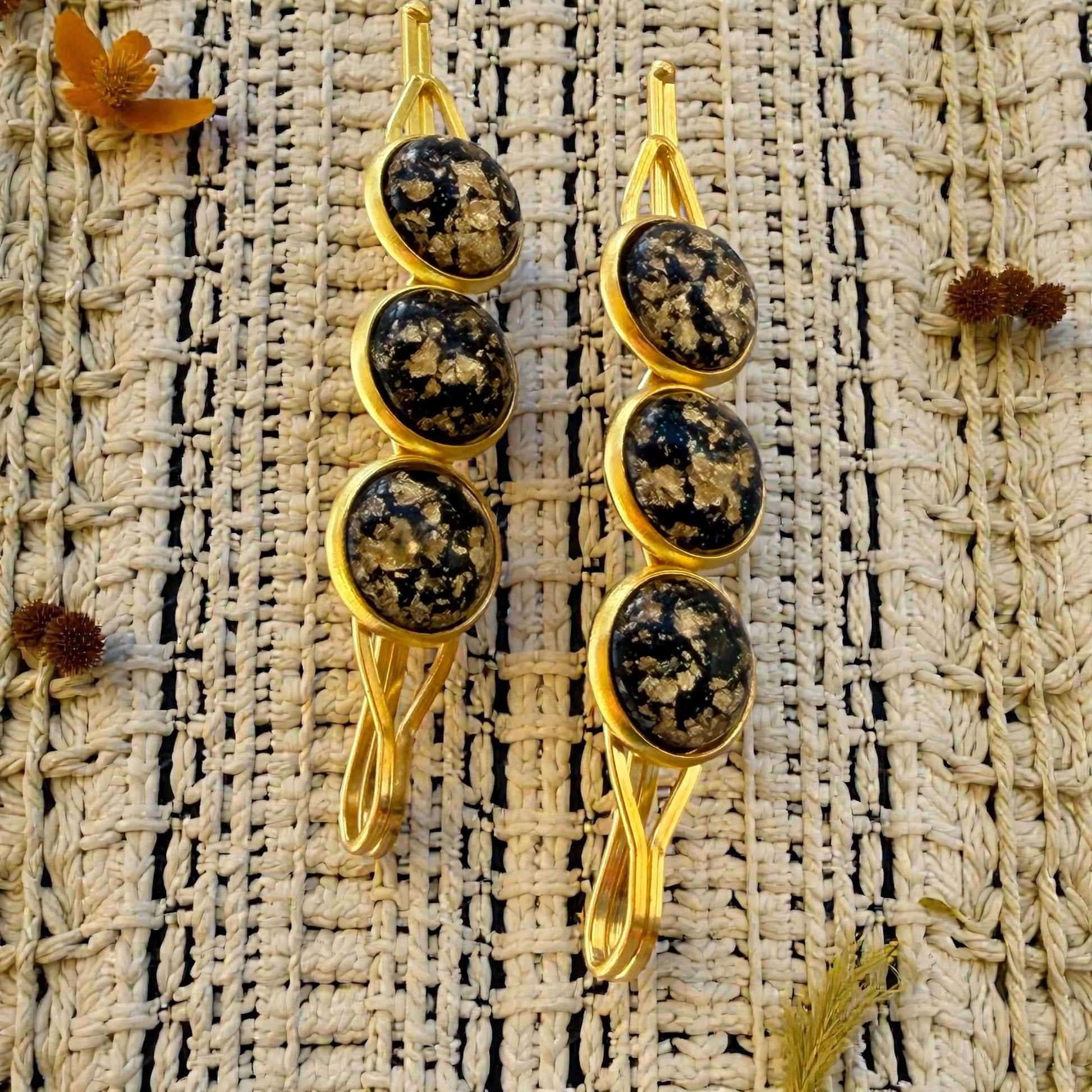 - Materials: Gold tone alloy hair pins, resin cabochons with gold foil effect, jewelry-grade adhesive