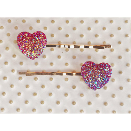 Pink Glitter Druzy Heart Hair Pins -Romantic Accessories