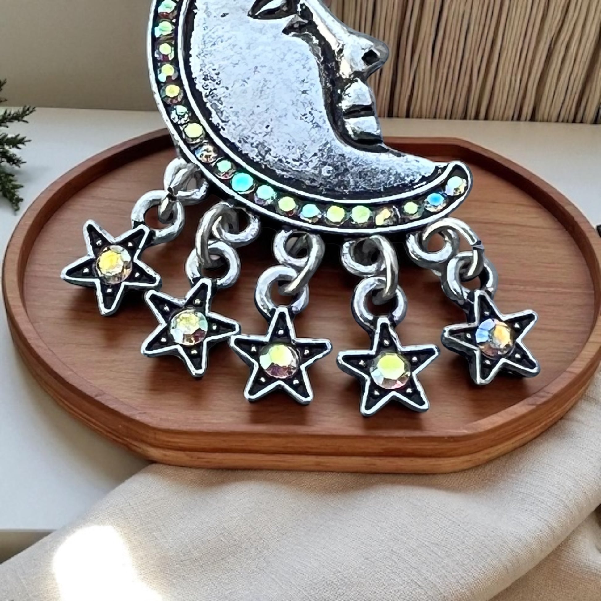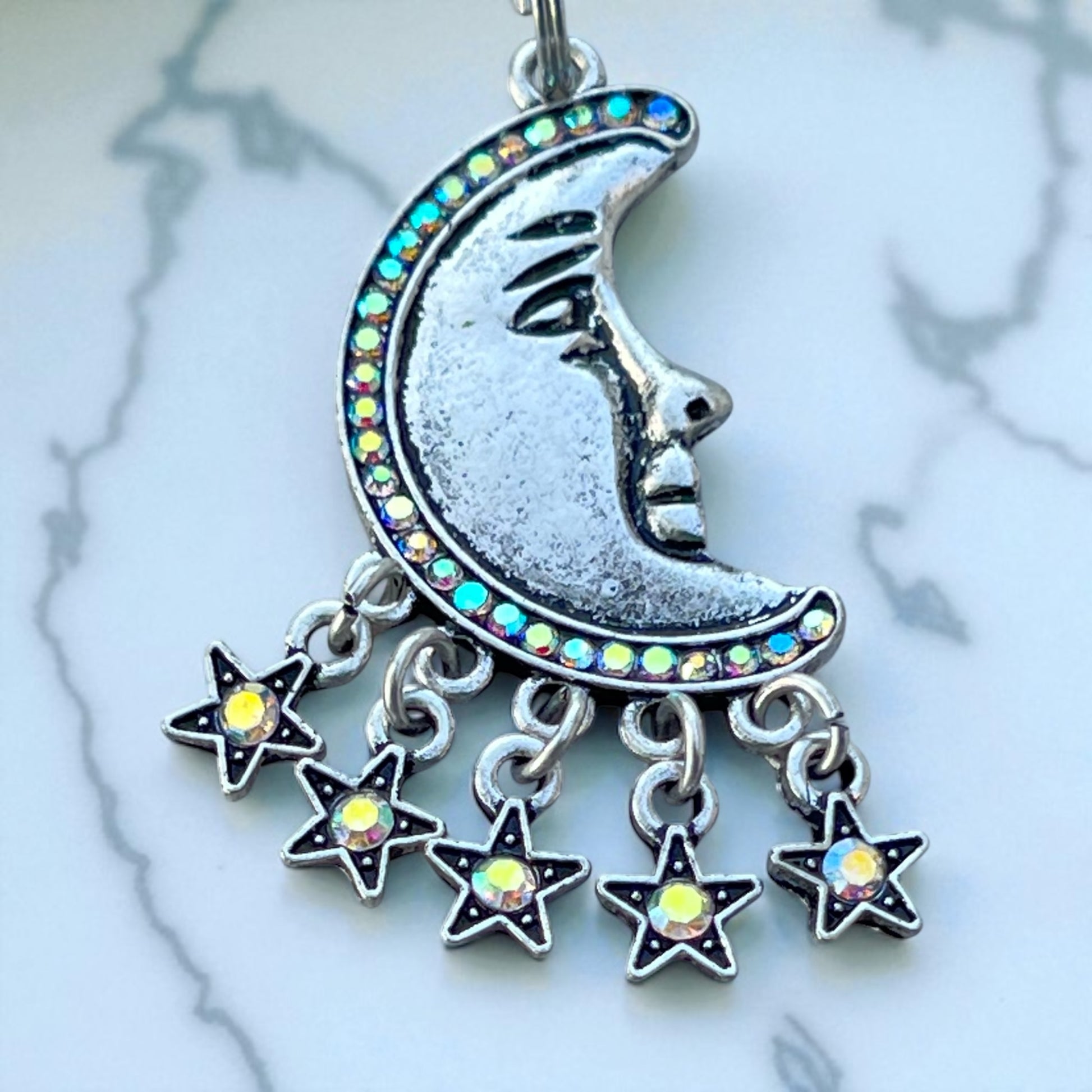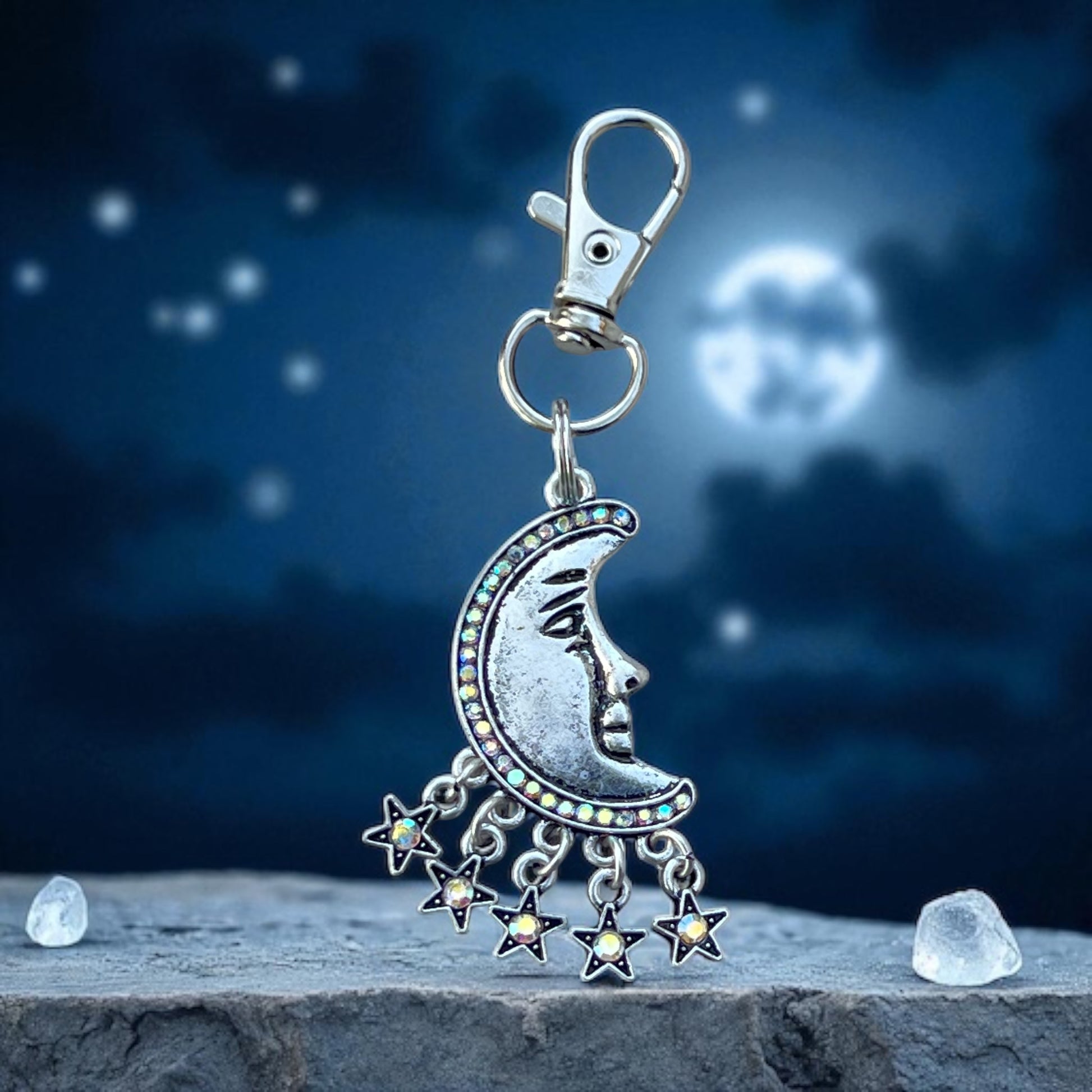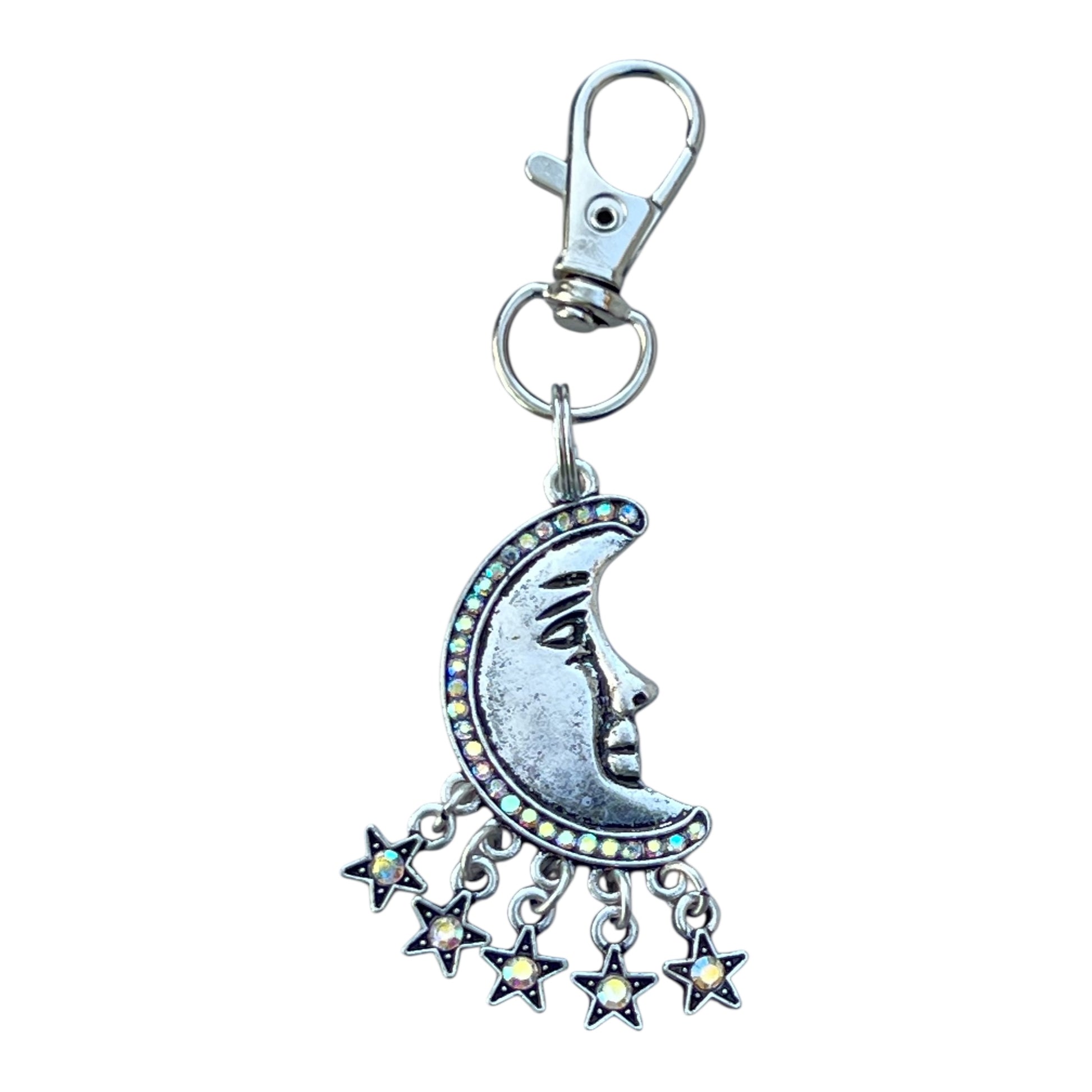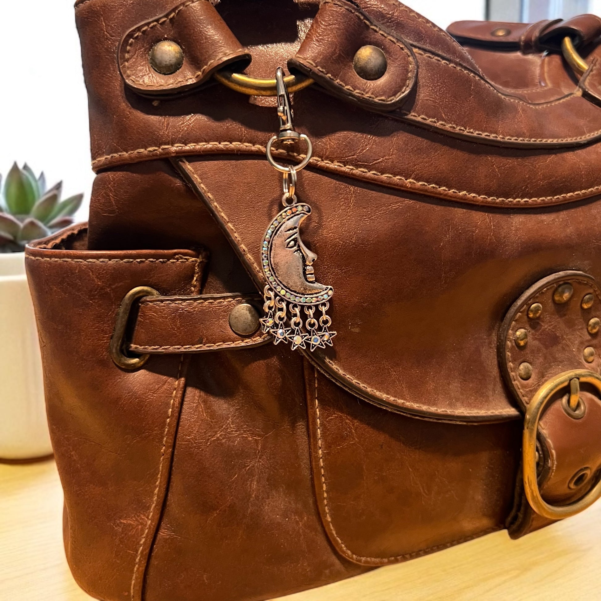 Add a dreamy, celestial touch to your favorite bag with this Moon Purse Charm. Featuring a silver-tone crescent moon adorned with rhinestones and dangling stars, this charm is a perfect blend of boho magic and cosmic beauty. Lightweight yet eye-catching, it's a lovely accessory for astrology lovers and spiritual souls alike.
