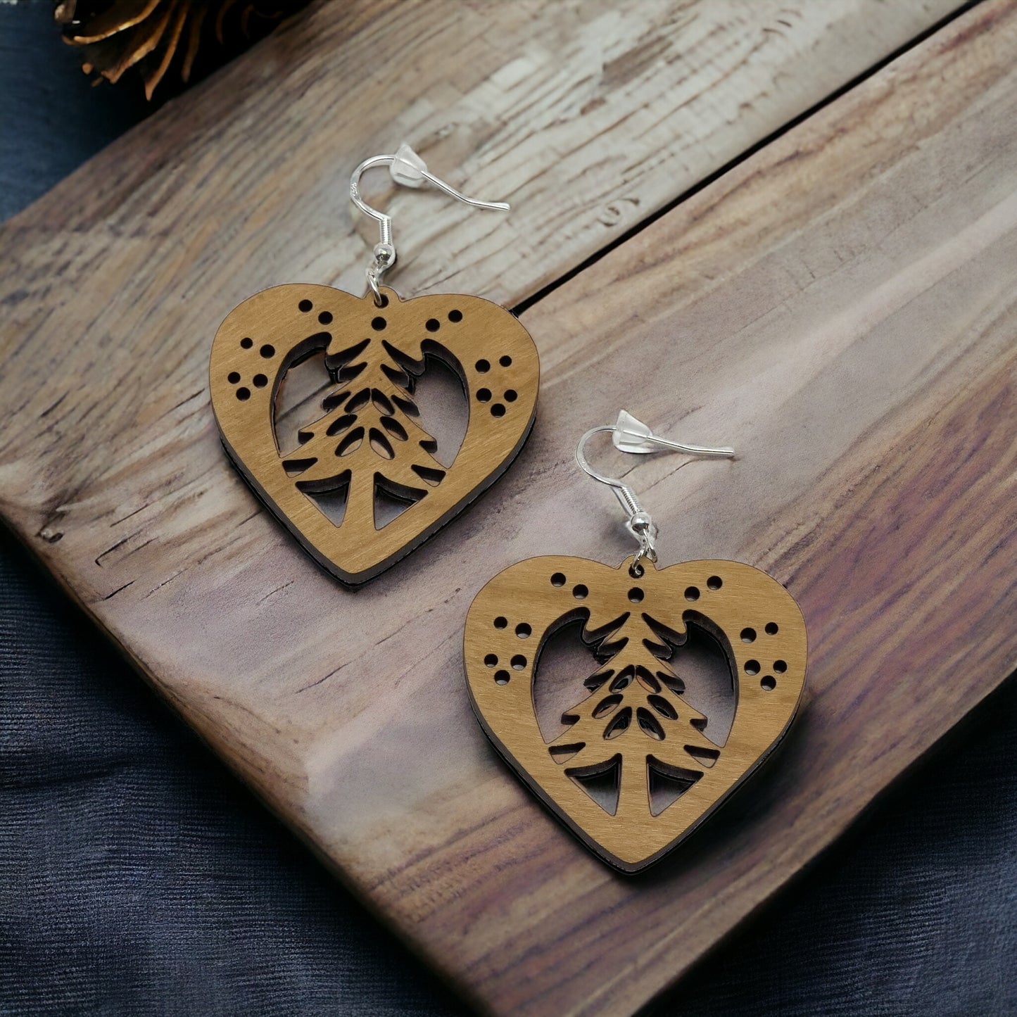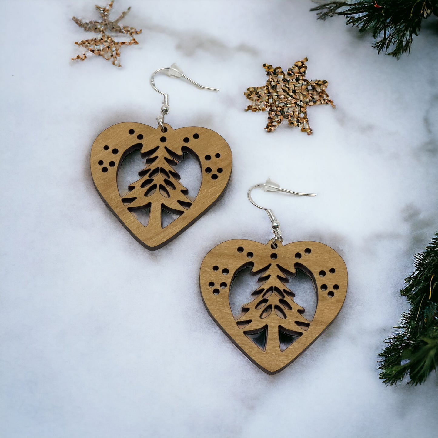 Heart Tree Cutout Earrings – Wooden Christmas Forest Dangles with Gold Hooks