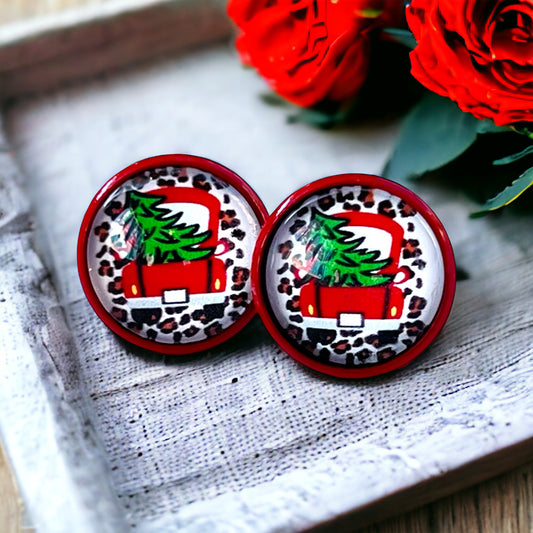 Red Truck with Christmas Tree Stud Earrings: Rustic Farmhouse Holiday Charm for Your Ears