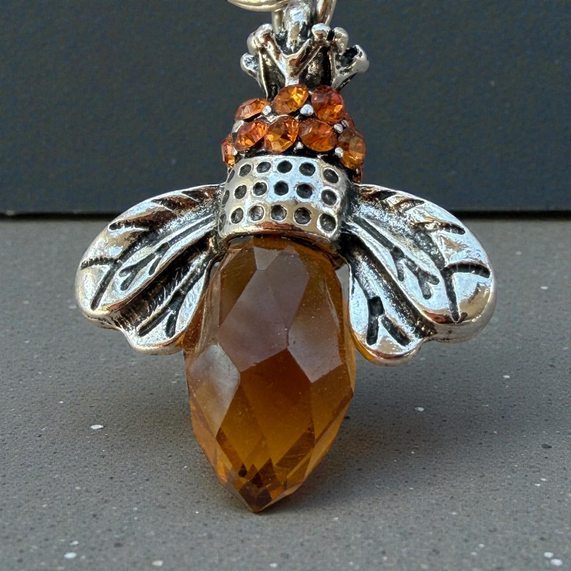 - Materials: zinc alloy metal (silver-tone), faceted amber-toned bead, glass rhinestones