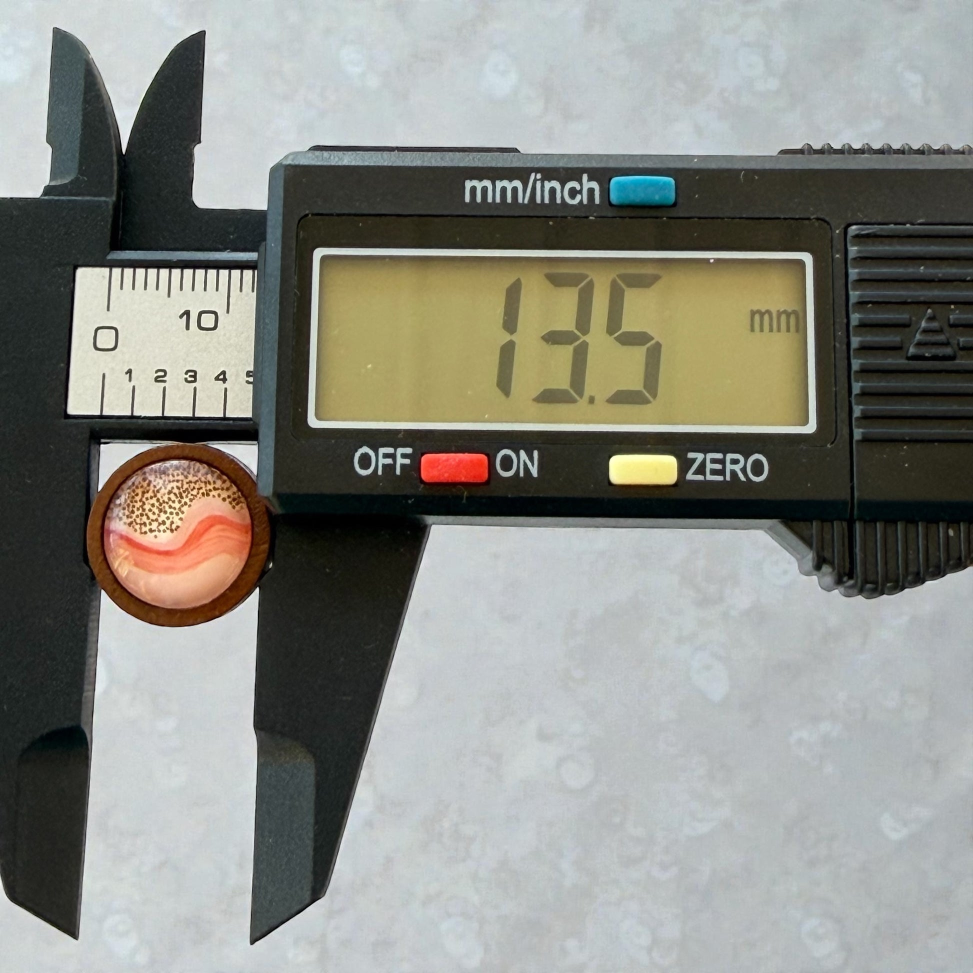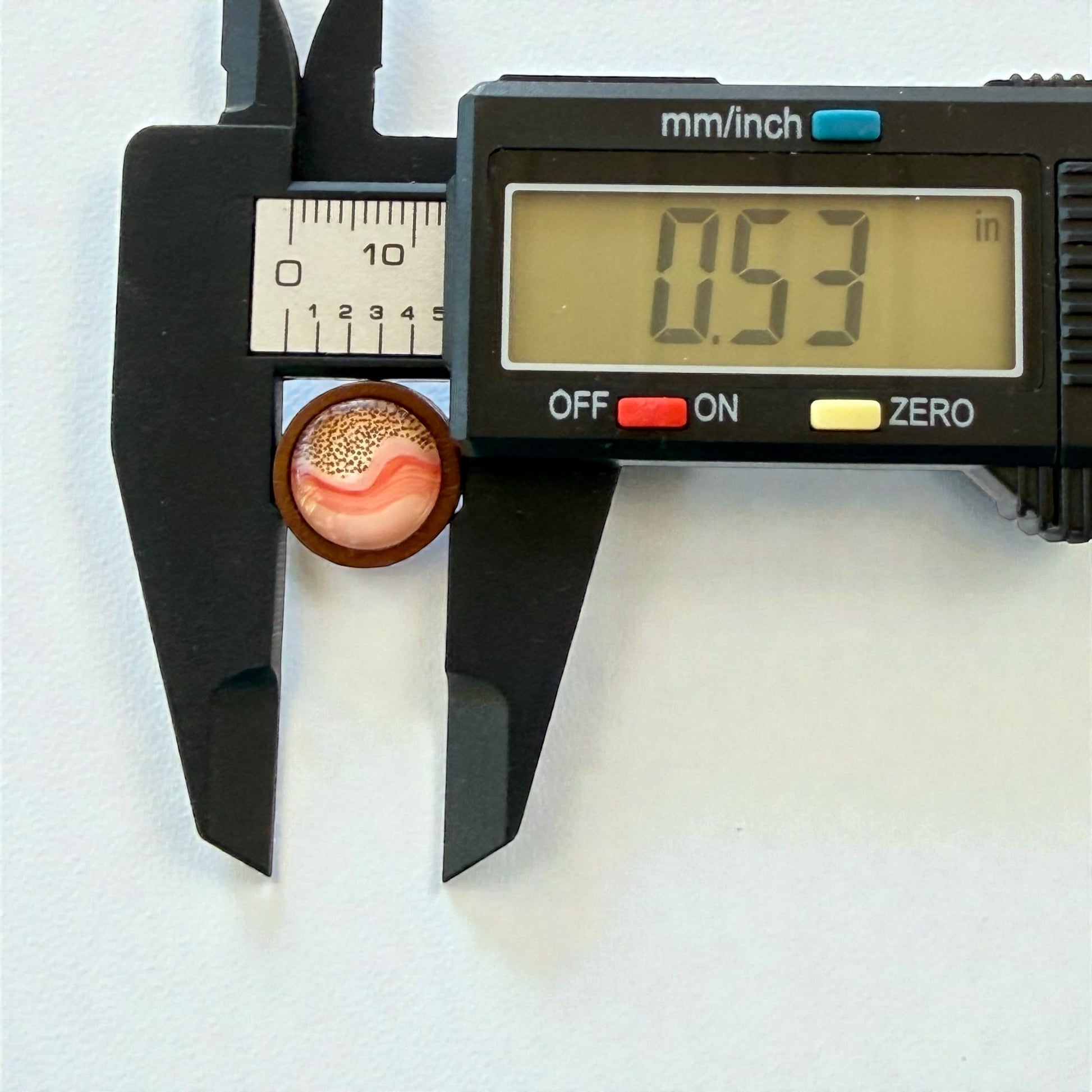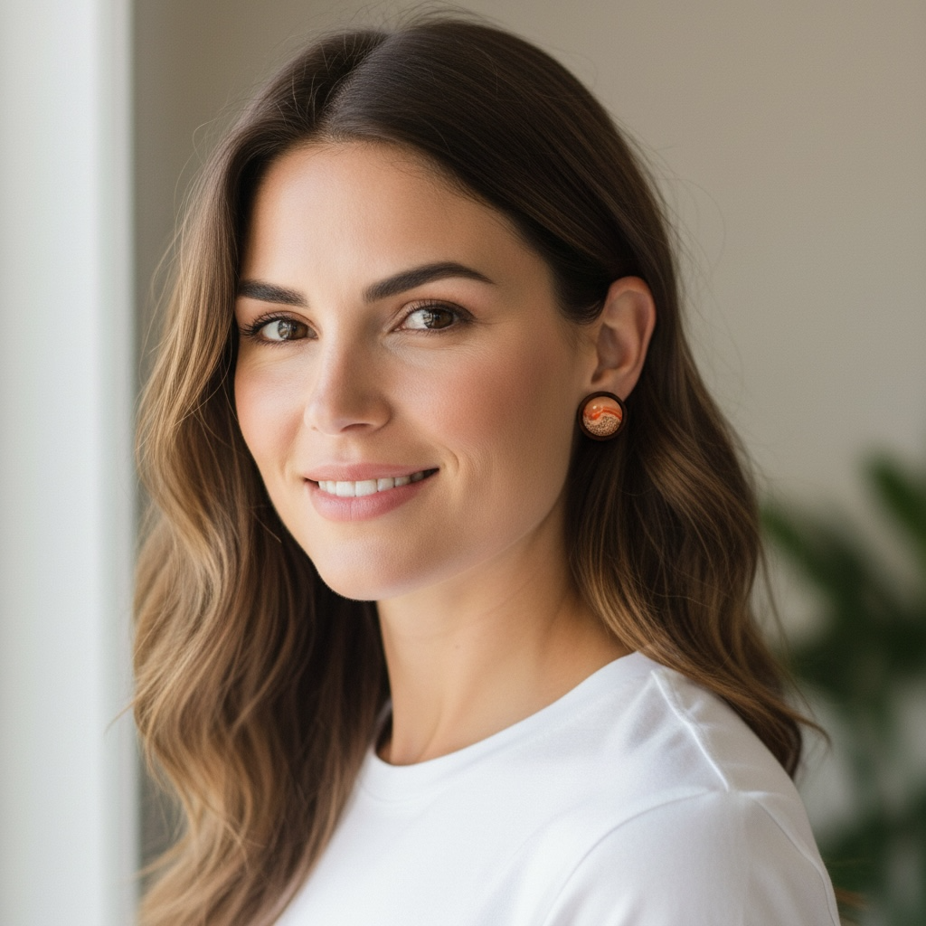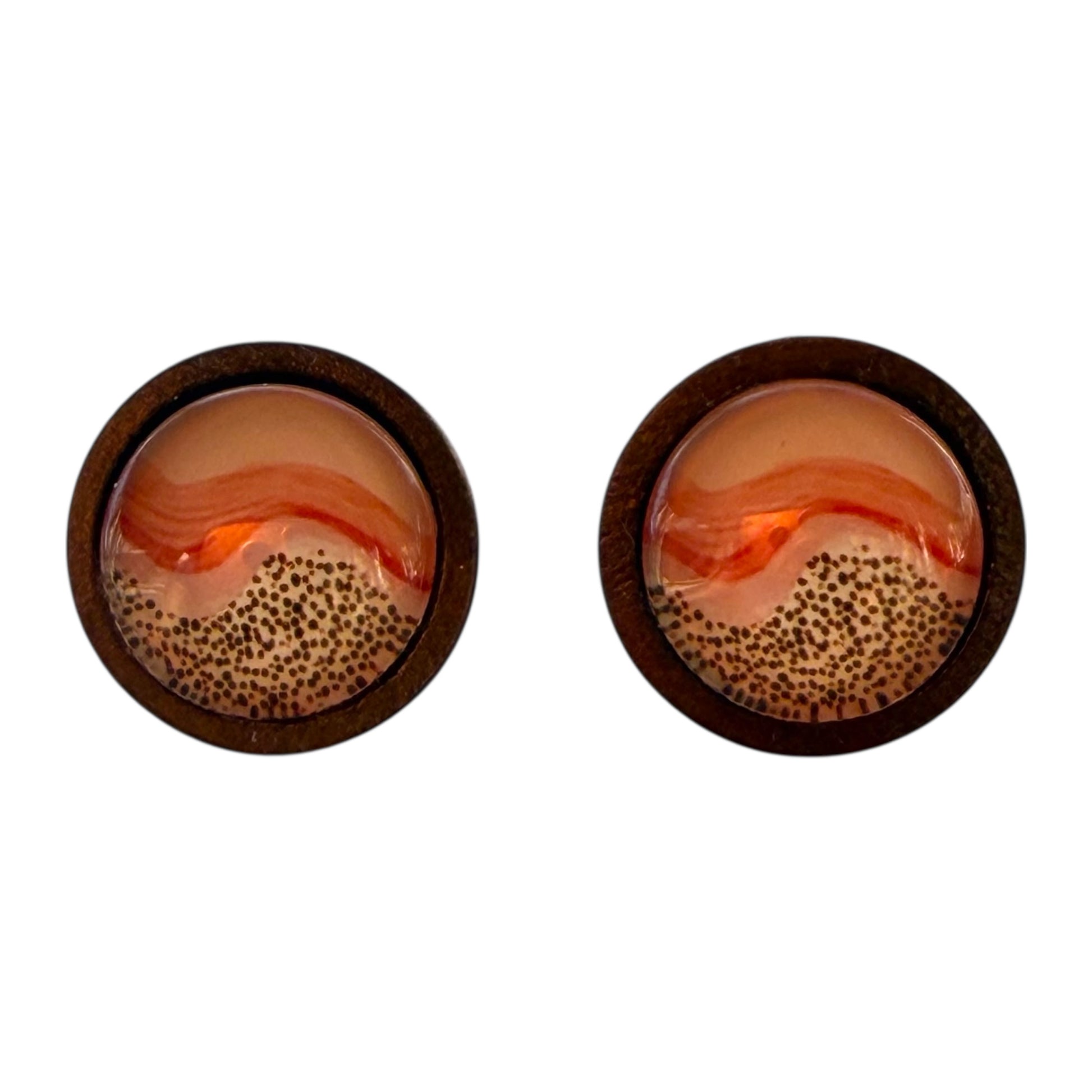 These desert sunrise wood stud earrings are made for earthy, boho hearts. The warm peach and terracotta curves look like sunlit canyon layers or a golden hour horizon, framed by a deep wood setting that keeps the look grounded and natural.