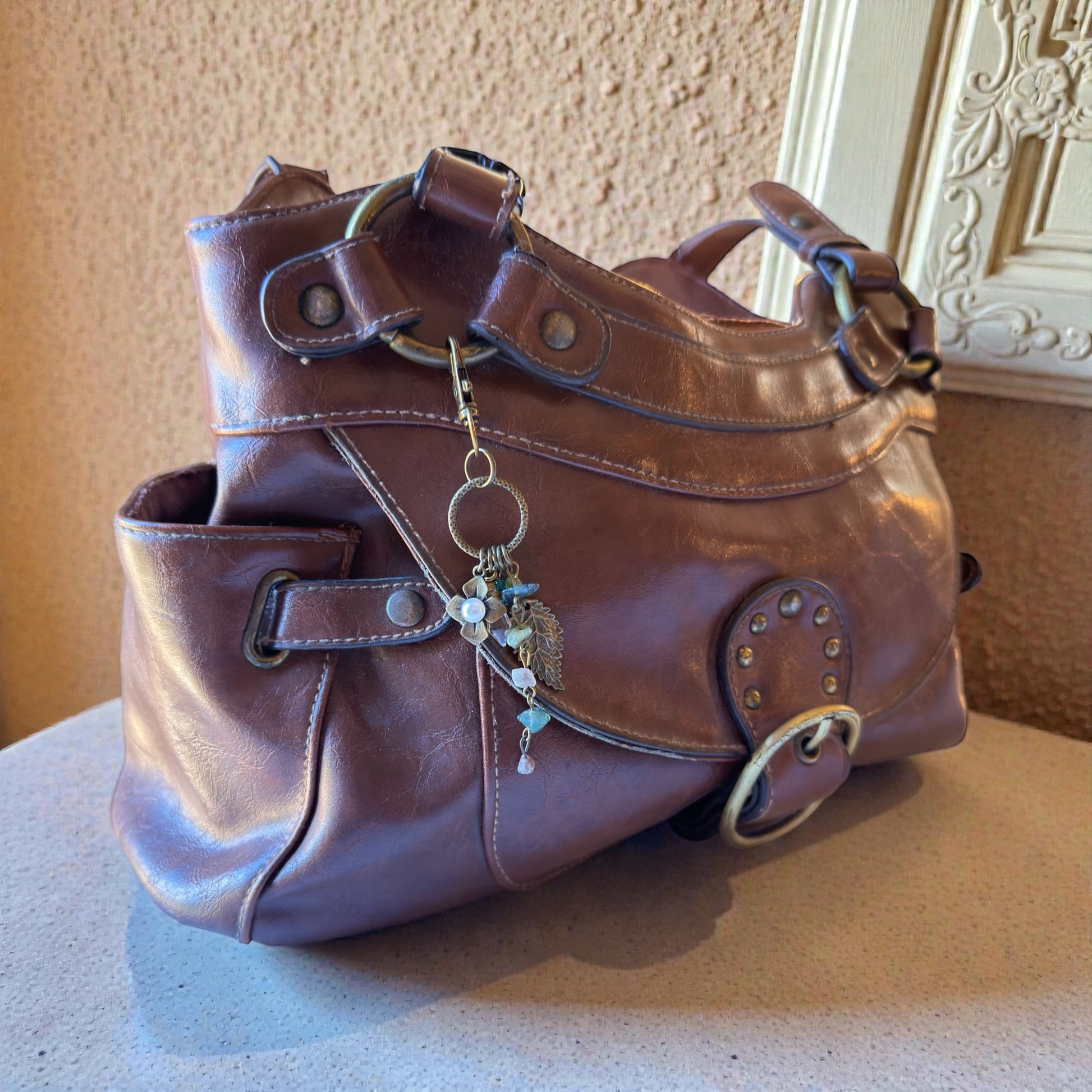 • Main focal: textured ring with large leaf charm, flower charm with faux pearl, crystal-style glass drop, stone chip dangle