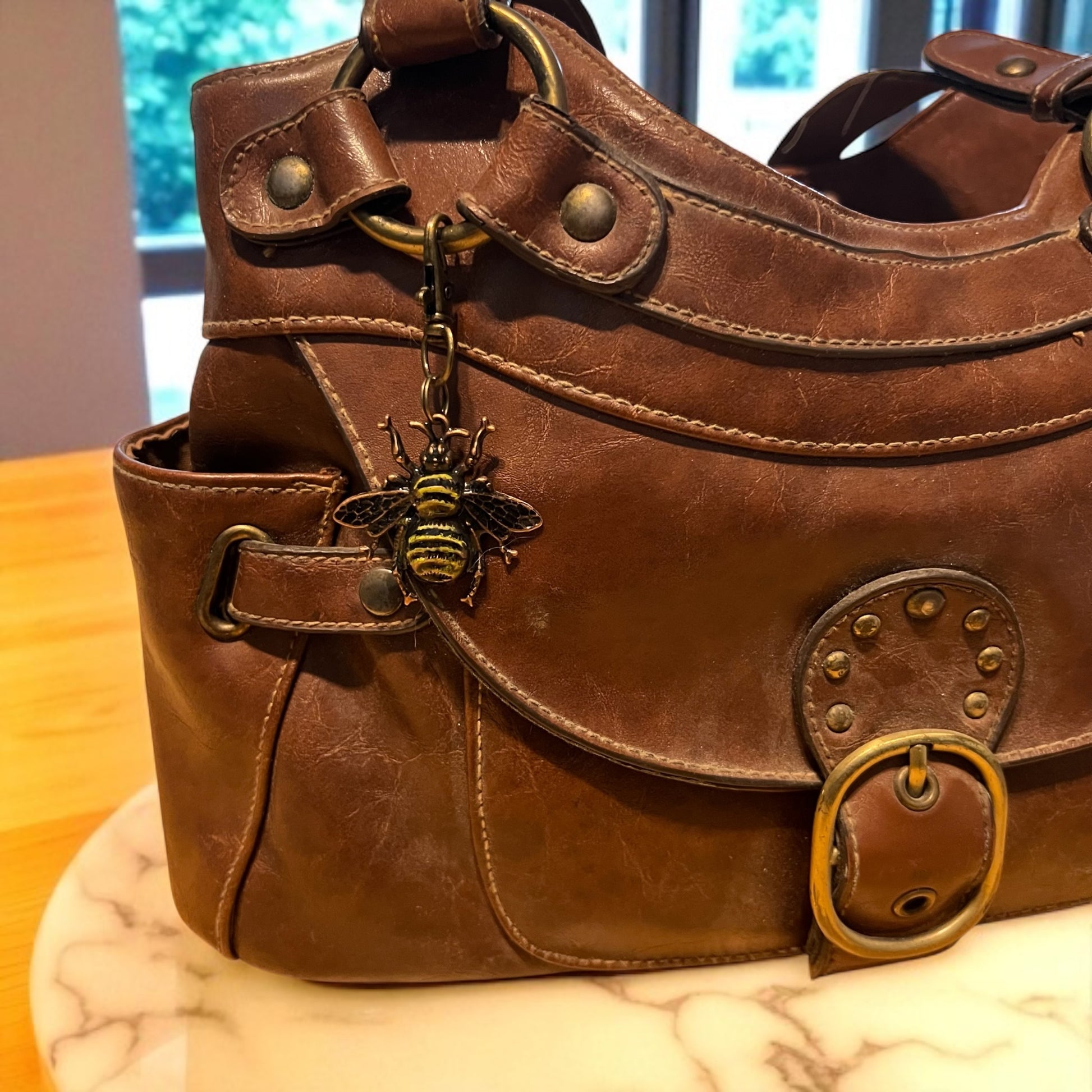 This bold bee purse charm brings a little buzz of personality to any bag. The copper-tone bee is hand painted with yellow stripes and dark wings, then sealed in glossy resin so every curve catches the light. The brass-tone clasp adds a vintage touch and makes it easy to clip onto your purse strap, tote, backpack, or keys in seconds.