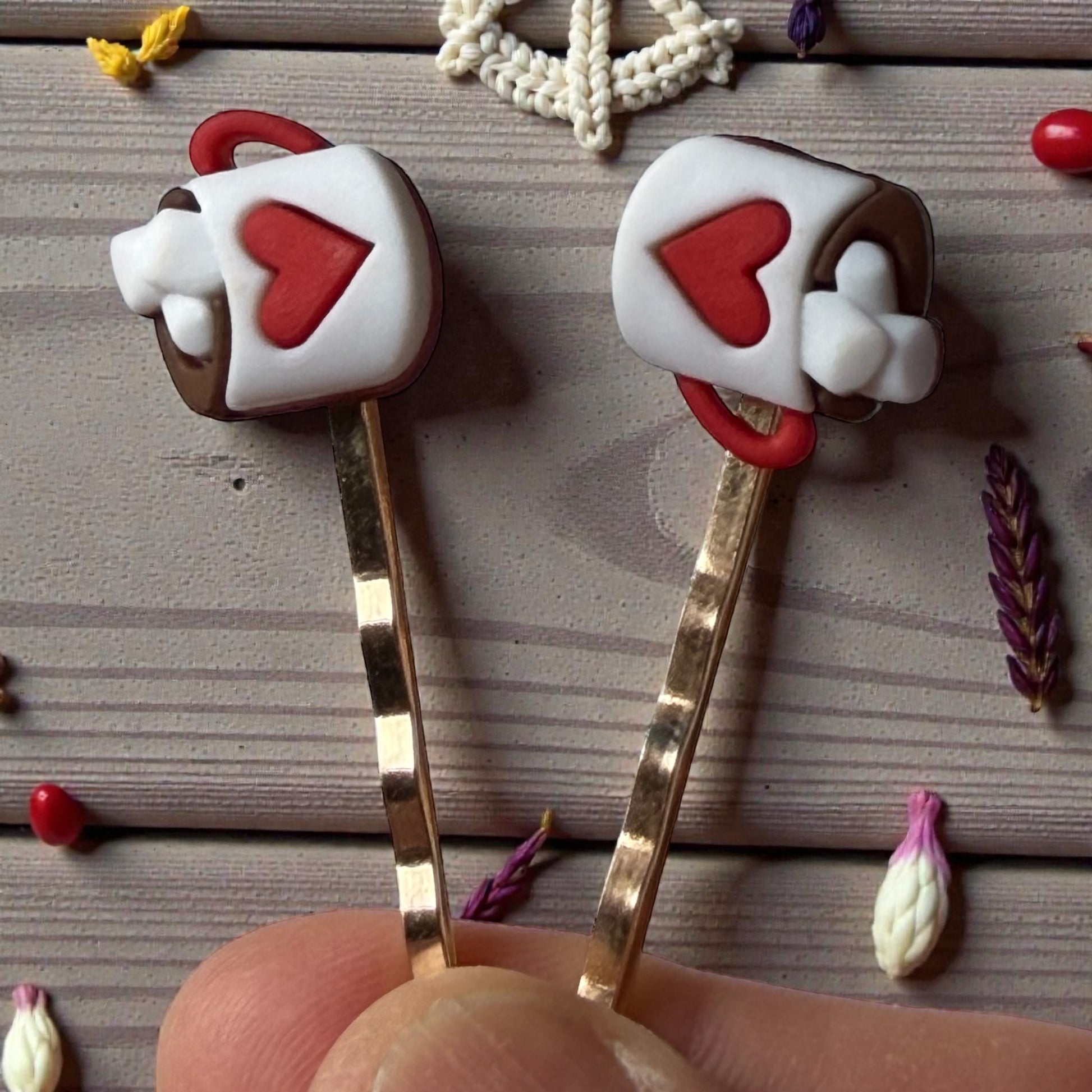 - Quantity: Set of 2 matching hot cocoa mug hair pins