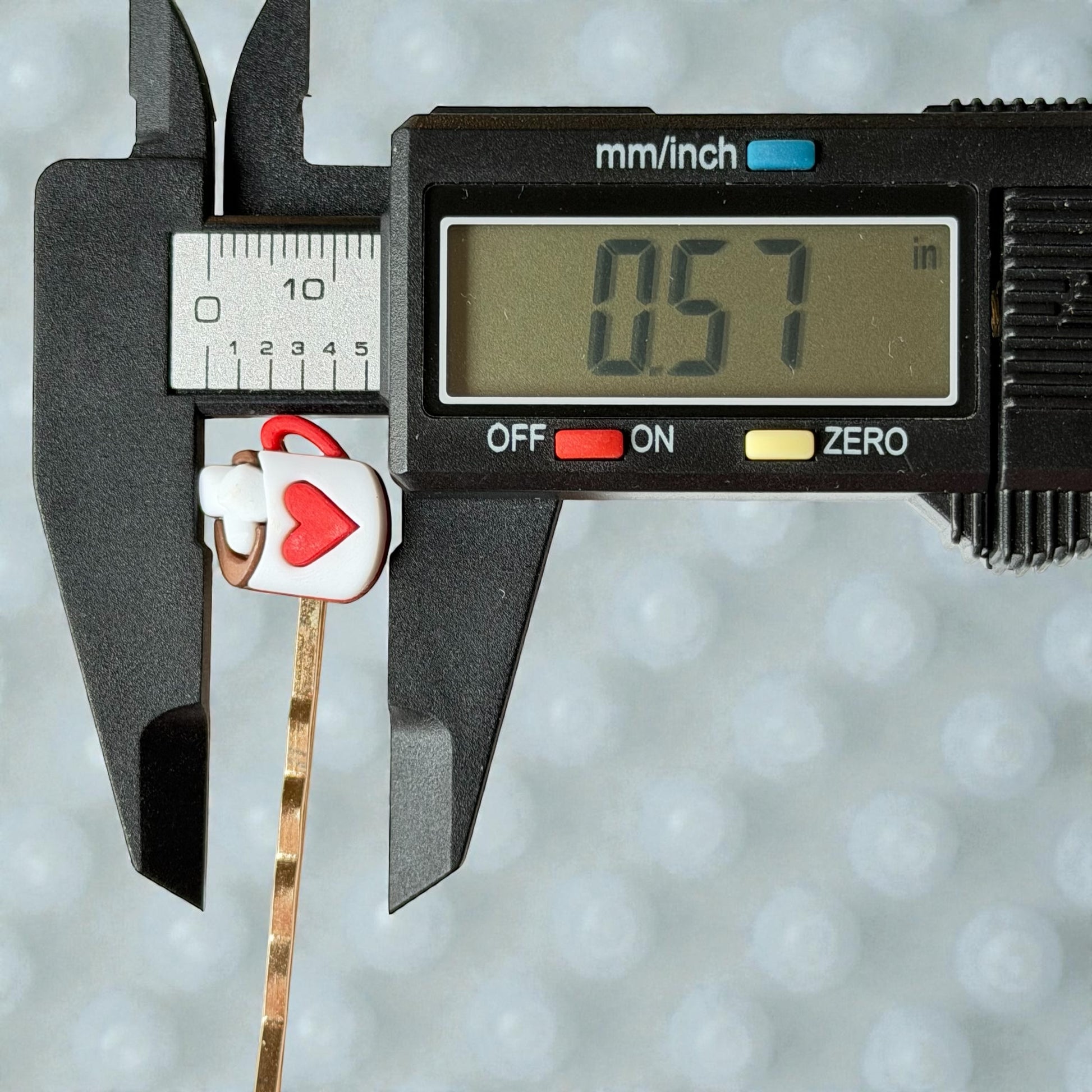 - Colors: White mug, red heart and handle, brown cocoa, white marshmallows, gold-tone pin