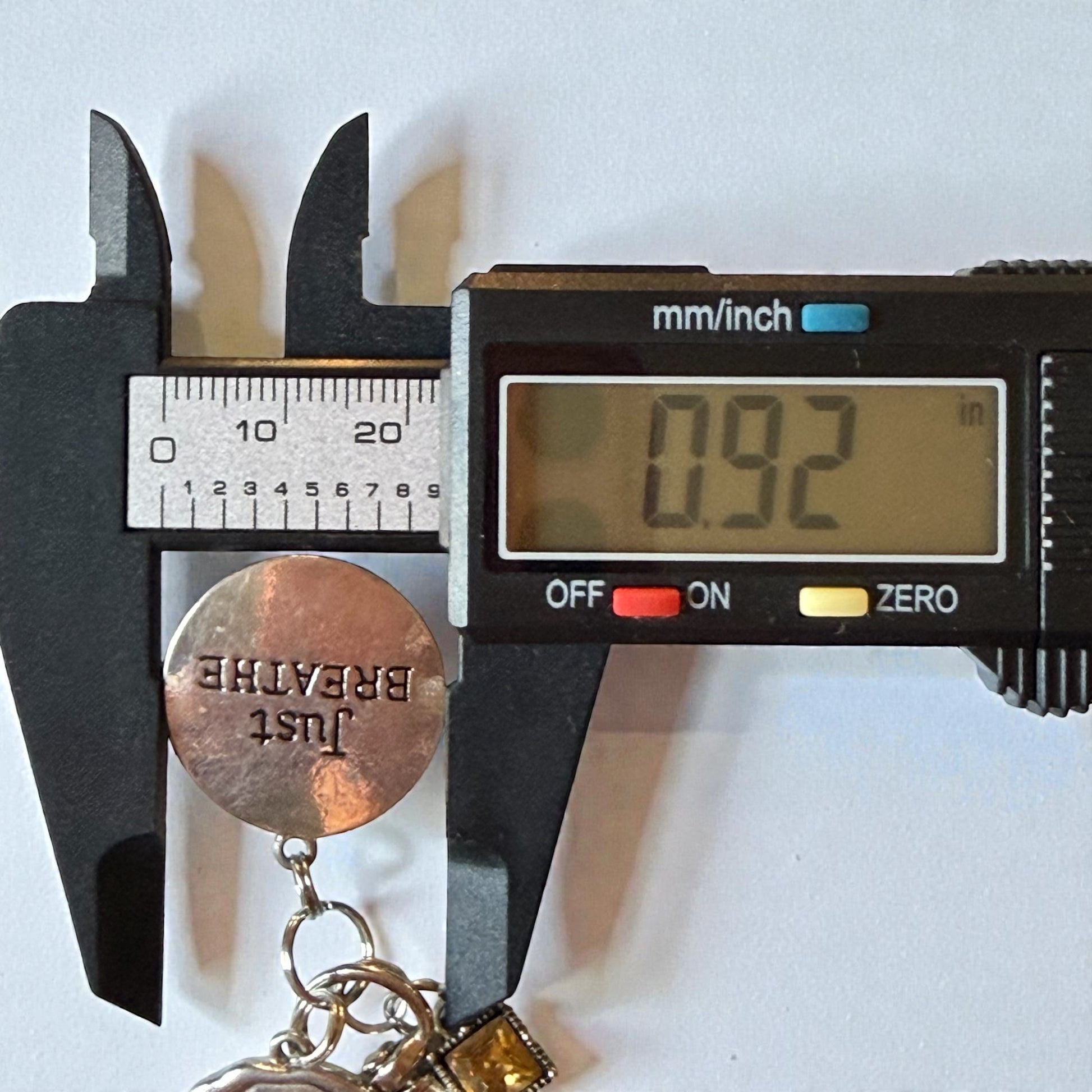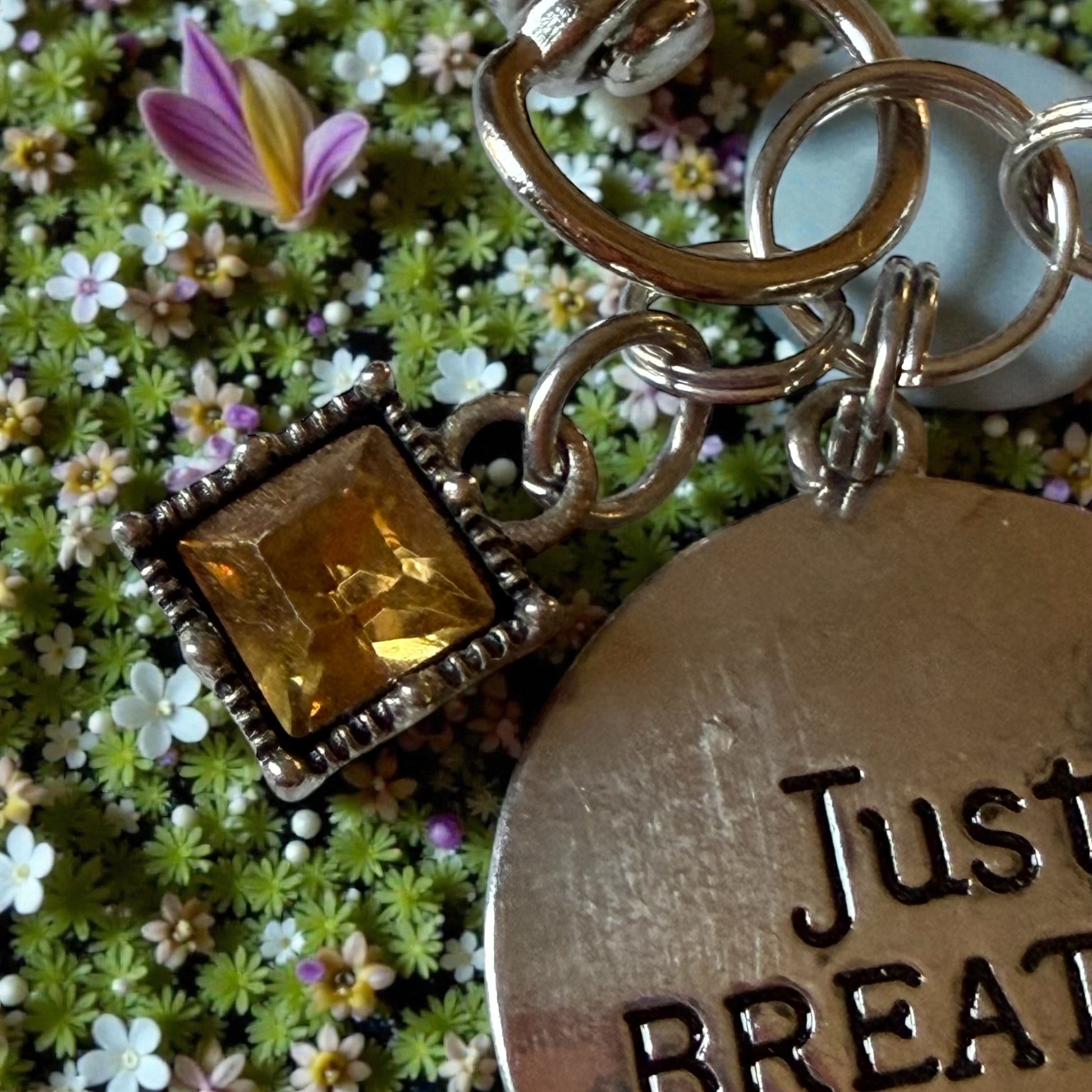 - Charms: Lotus medallion, “Just BREATHE” round disc, yellow square gem