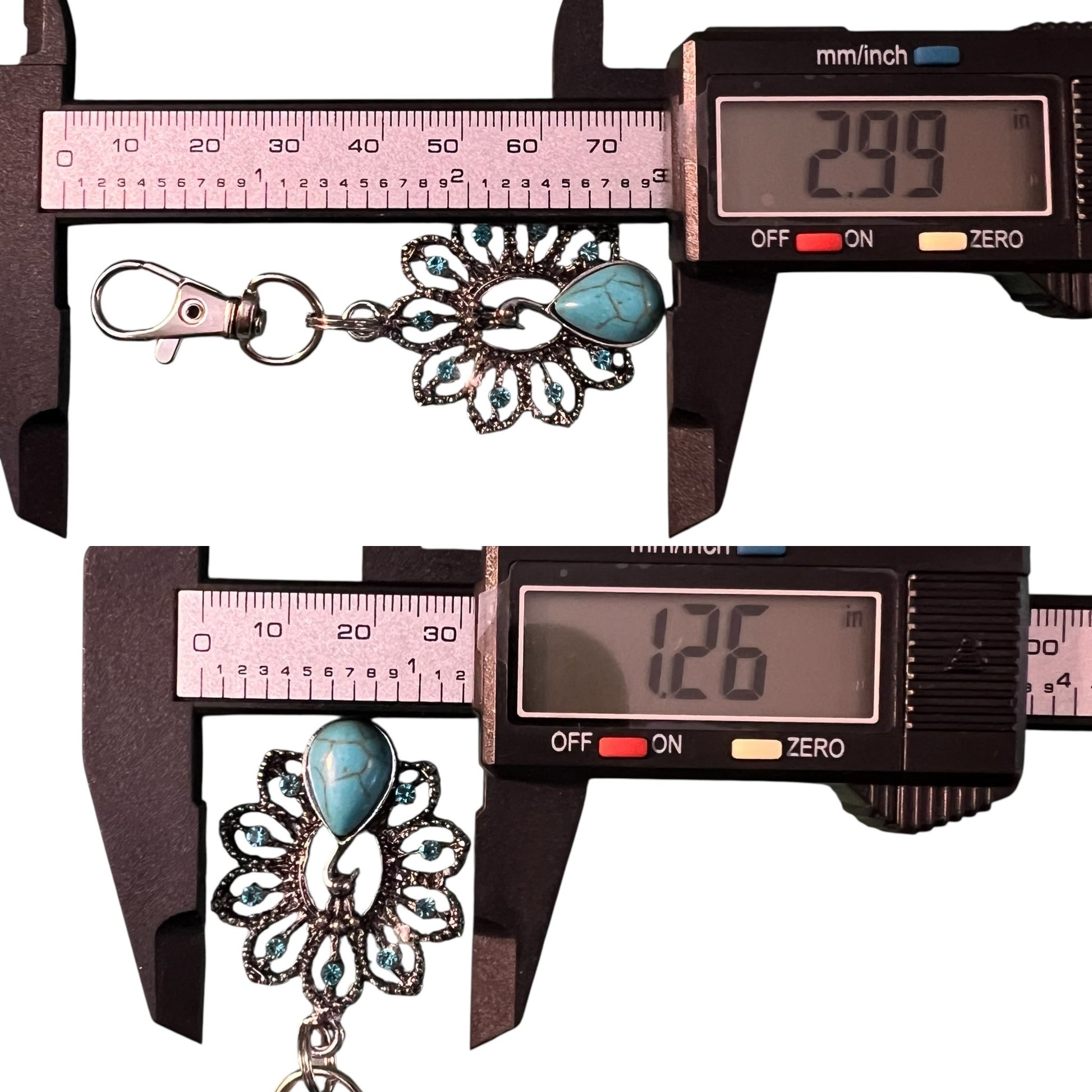 Elevate your accessories with this stunning handmade synthetic turquoise peacock keychain charm, designed to symbolize grace, beauty, and confidence. This intricate silver toned peacock design is adorned with a teardrop synthetic turquoise gemstone body, while shimmering blue crystal accents embellish the detailed feathered tail. Perfect as a boho-style purse charm, handbag accessory, or a unique keyring, this lightweight yet durable piece is ideal for those who love elegant, nature-inspired jewelry.