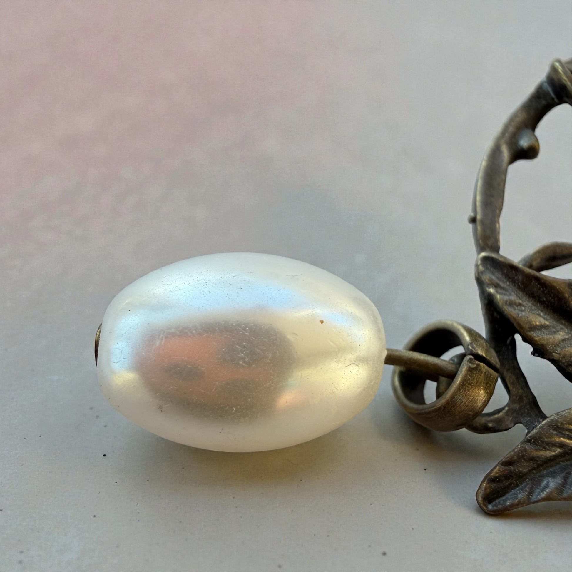 - Bead: Oval faux pearl drop with soft glow